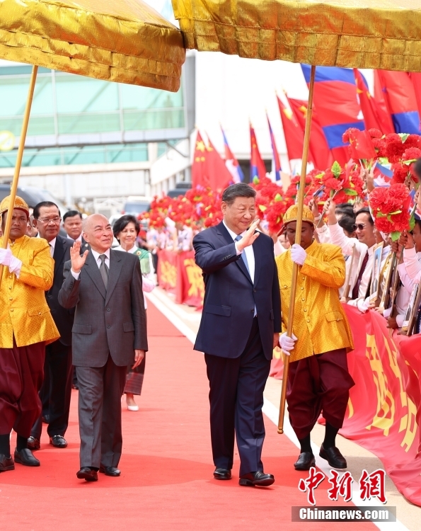 當(dāng)?shù)貢r(shí)間4月17日上午,中國(guó)國(guó)家主席習(xí)近平乘專機(jī)抵達(dá)金邊,應(yīng)柬埔寨國(guó)王西哈莫尼邀請(qǐng),對(duì)柬埔寨進(jìn)行國(guó)事訪問(wèn)。西哈莫尼在機(jī)場(chǎng)為習(xí)近平舉行隆重歡迎儀式。 中新社記者 盛佳鵬 攝