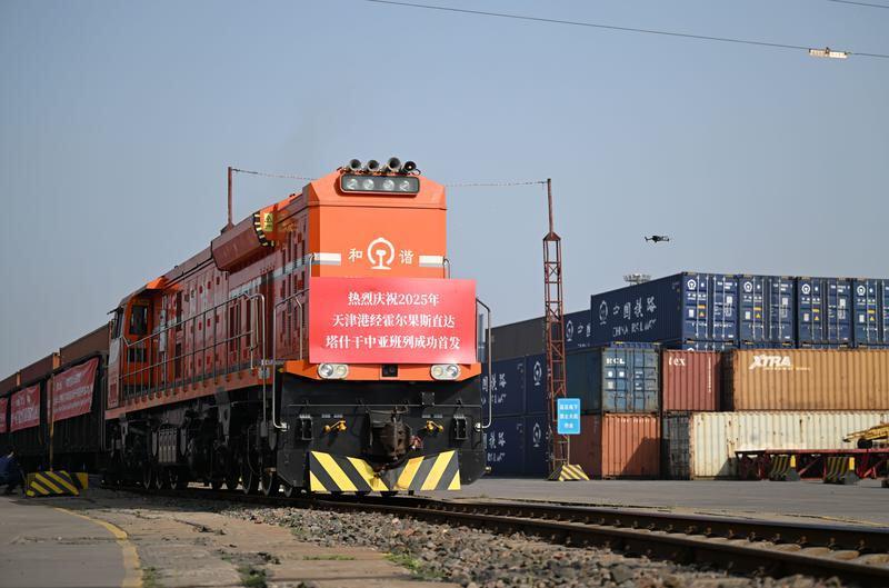 △5月20日,2025年首列天津港經霍爾果斯直達塔什干的中亞班列從天津港物捷三堆場發(fā)車。