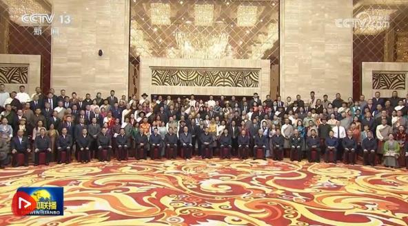 習近平等來到接見現場時,全場響起長時間熱烈掌聲。習近平向大家揮手致意,不時同代表親切交流,并同大家合影留念。