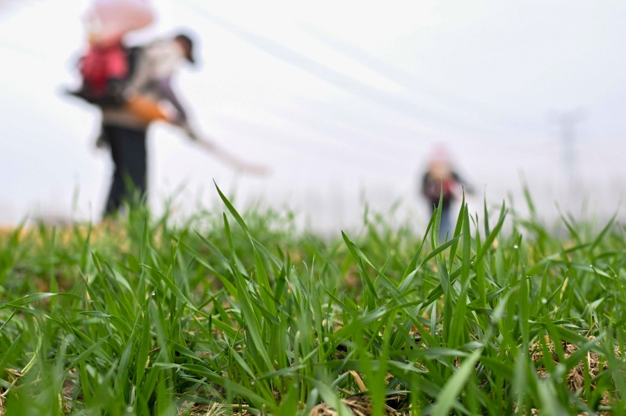 2026年2月4日,農民在江蘇省昆山市錦溪鎮長云村麥田間噴打化肥。新華社發(王須中攝)