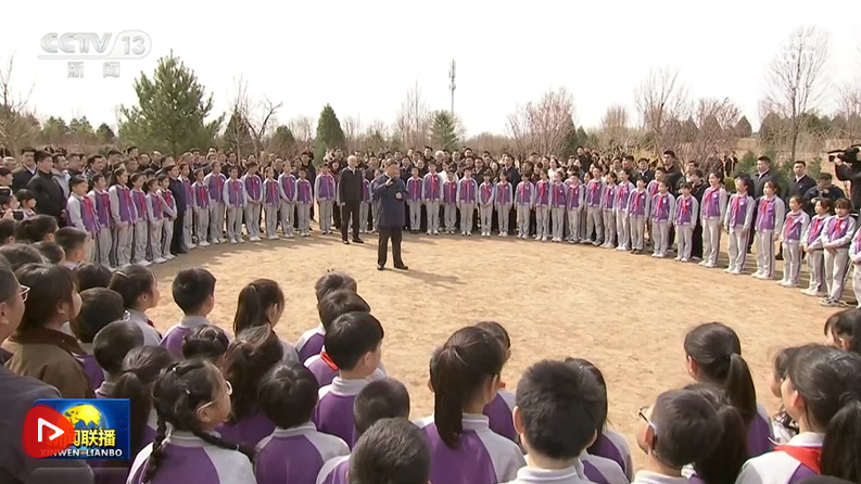 3月30日,黨和國家領導人習近平、李強、趙樂際、王滬寧、蔡奇、丁薛祥、李希等來到北京市昌平區百善鎮參加首都義務植樹活動。這是習近平同在場的干部群眾、少先隊員親切交談。
