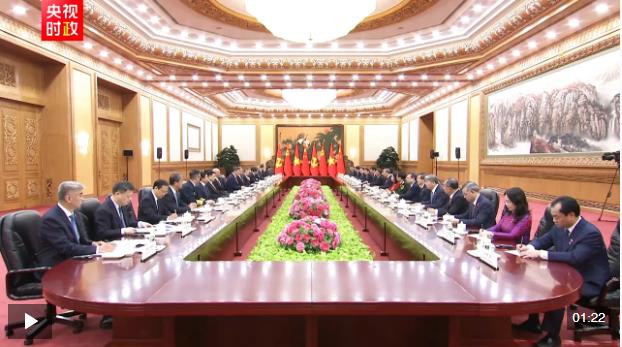 習近平指出,你當選越南國家主席后第一時間到訪中國,體現了你對發展中越關系的高度重視。無論國際形勢如何變化,中方始終將越南作為周邊外交優先方向,愿同越方秉持初心、賡續友誼,團結協作、相互支持,高質量推進全面戰略合作,加快構建更高水平具有戰略意義的中越命運共同體。
