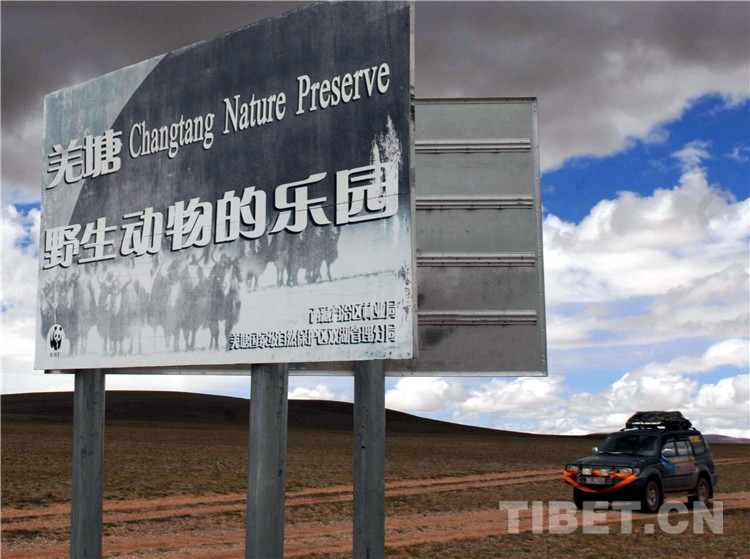 圖為一輛自駕游車輛通過羌塘國家級自然保護區的標志牌(2009年) 攝影:唐召明