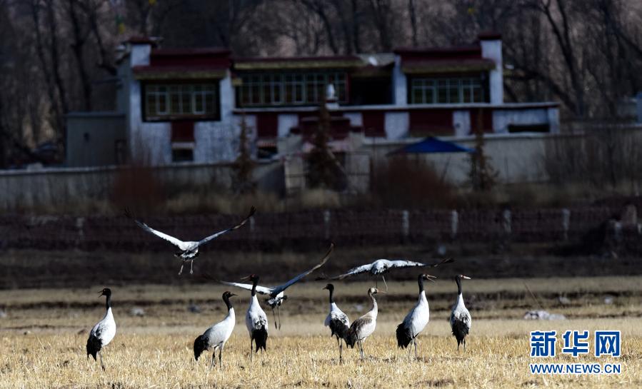 棲息在林周縣卡孜鄉農田里的黑頸鶴(12月12日攝)。新華社記者 張汝鋒 攝