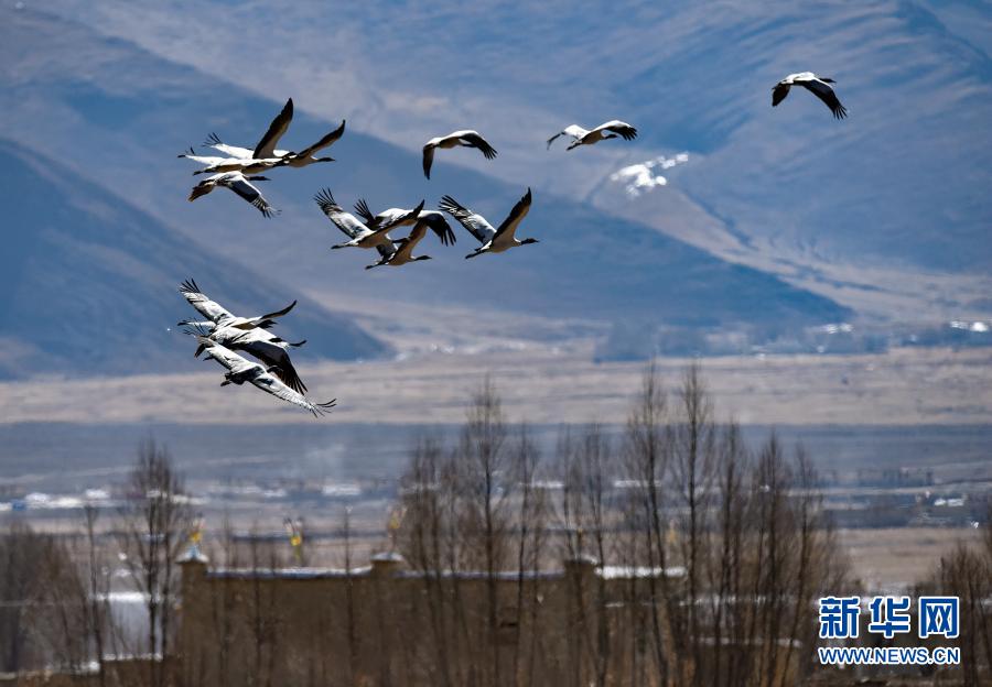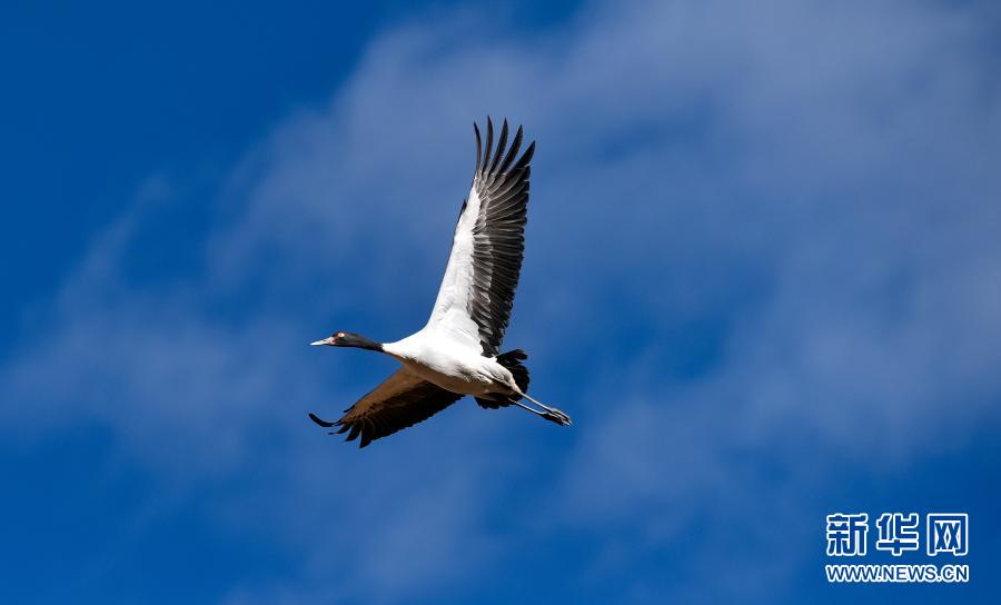 黑頸鶴在林周縣黑頸鶴自然保護區上空飛翔(12月12日攝)。新華社記者 黃豁 攝