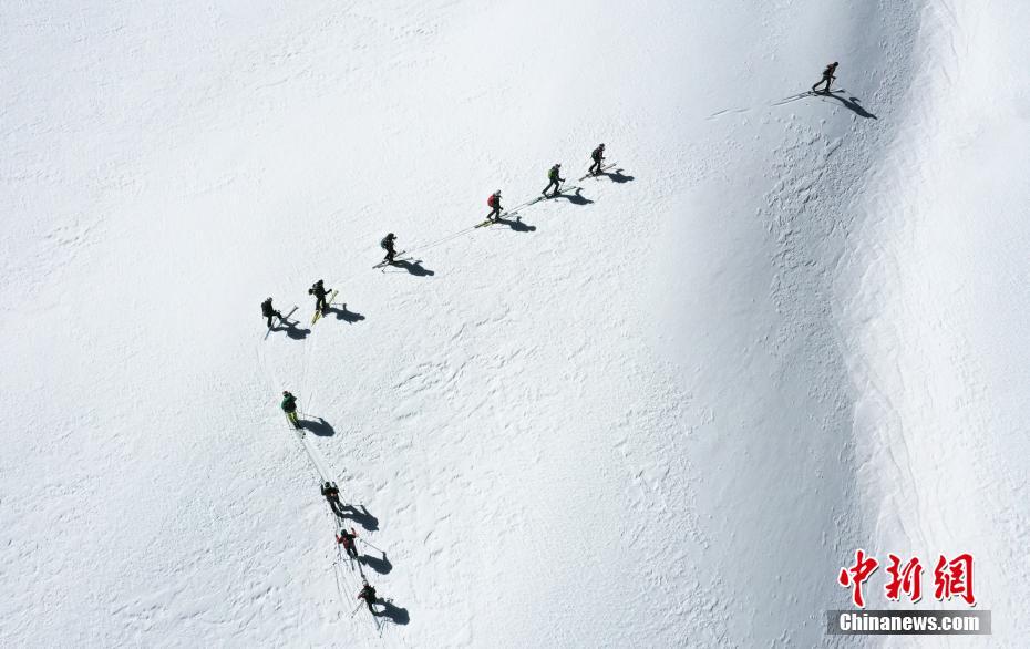 西藏拉薩河谷1號(hào)冰川(廓瓊崗日冰川)景區(qū)將與2021年4月正式全面開(kāi)放,洛堆峰雪山攀登項(xiàng)目也將正式啟動(dòng)。資料圖為登山愛(ài)好者攀登洛堆峰。(無(wú)人機(jī)拍攝)中新社發(fā) 貢嘎來(lái)松 攝