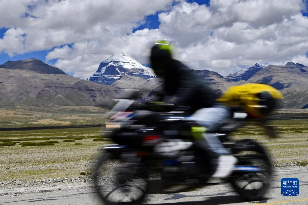 騎手駕駛摩托車經過岡仁波齊景區(8月2日攝)。新華社記者 張汝鋒 攝