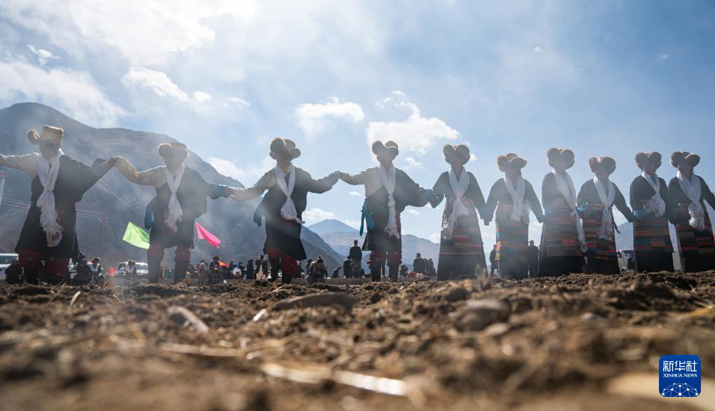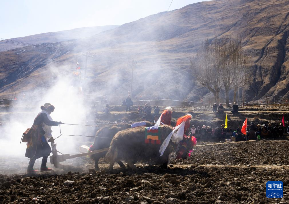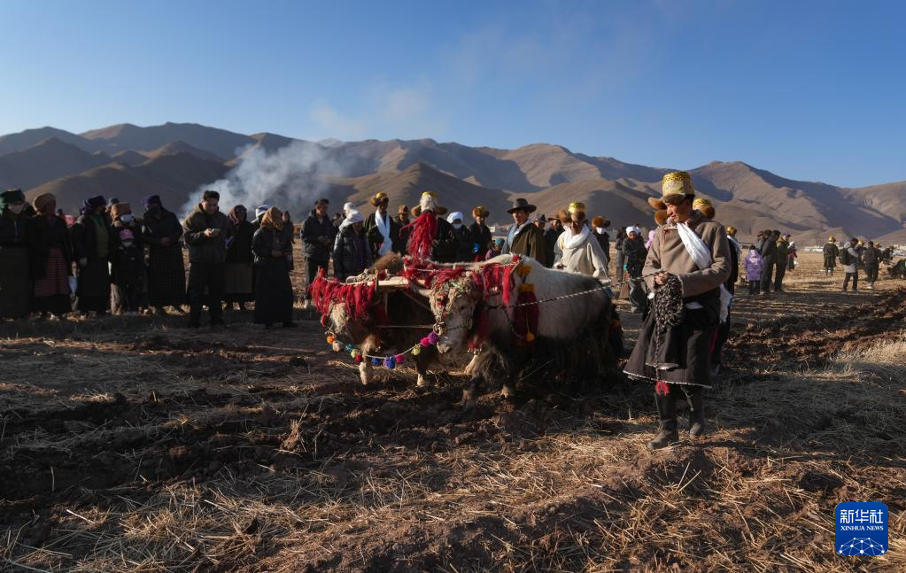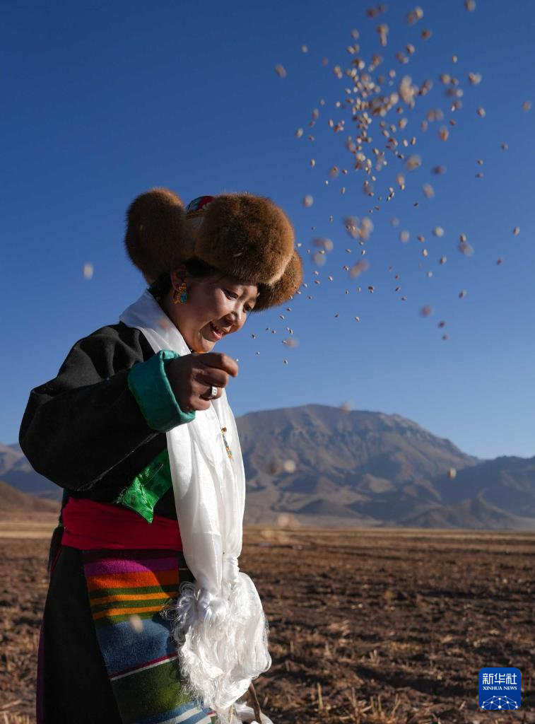 當日是西藏農民舉行一年一度春耕大典的日子。村民沿襲著傳承千年的春耕民俗,身著節日盛裝,手捧“切瑪”(五谷豐登斗),唱起祈愿歌,互敬青稞酒。當鐵犁翻開土地,婦女將手中的種子撒下,祈求新的一年豐收。