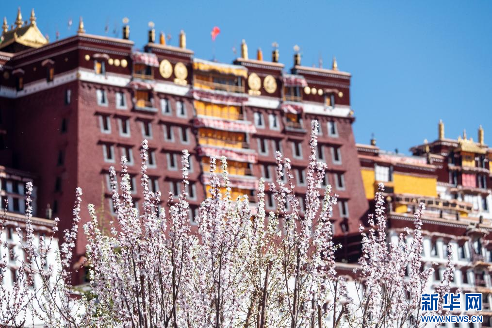 3月15日,杏花映襯下的布達拉宮。新華網 旦增努布 攝