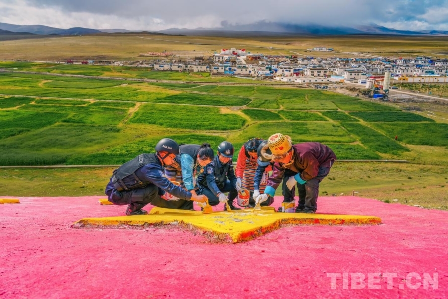 中國西藏網訊 國慶節前夕,西藏邊檢總站日喀則邊境管理支隊崗巴邊境派出所民警攜手轄區群眾,共赴中印邊境吉汝村為國旗和黨旗描紅,以行動獻禮國慶。(中國西藏網 通訊員/葉軼 記者/趙振宇)