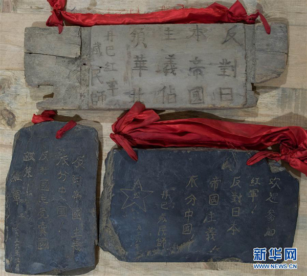 頂果山寺活佛丹貝降參收藏的當年紅軍留下的寫有“歡迎參加紅軍!反對日本帝國主義瓜分中國!”字樣的木刻石刻宣傳標語。