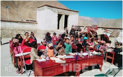 1月份,正是西藏最冷的時候,在寒冷的冬季輔導孩子們學習不是一件容易的事情。還好西藏冬日的陽光在中午的時候是暖和的,工作隊就利用中午光照充足、比較暖和的時間,將學生們集中到各村村委大院進行輔導學習活動。