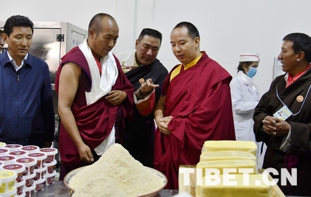 在雪林斯布牧場專業合作社考察調研過程中,十一世班禪通過參觀宣傳展板、聽取相關負責人匯報、參觀乳制品加工廠房等,詳細了解合作社的生產管理及運營。每到一處宣傳展板前,十一世班禪都停留片刻,仔細聆聽相關負責人的介紹,并針對一些細節問題進行詳細詢問。在參觀乳制品加工廠時,十一世班禪對車間里擺放的酥油筒產生了濃厚的興趣,饒有興致地手握長柄活塞,打起了酥油。看到乳制品加工廠里生產出的牦牛奶渣、酥油和酸奶,十一世班禪還品嘗了奶渣。