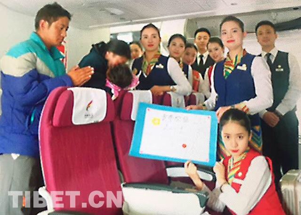 圖為2017年4月30日,TV9815從拉薩到北京執(zhí)飛途中,格桑花班組護送因燒傷急需赴京救治的1歲零7個月的貢布次旦一家,并為其募款。藏航供圖