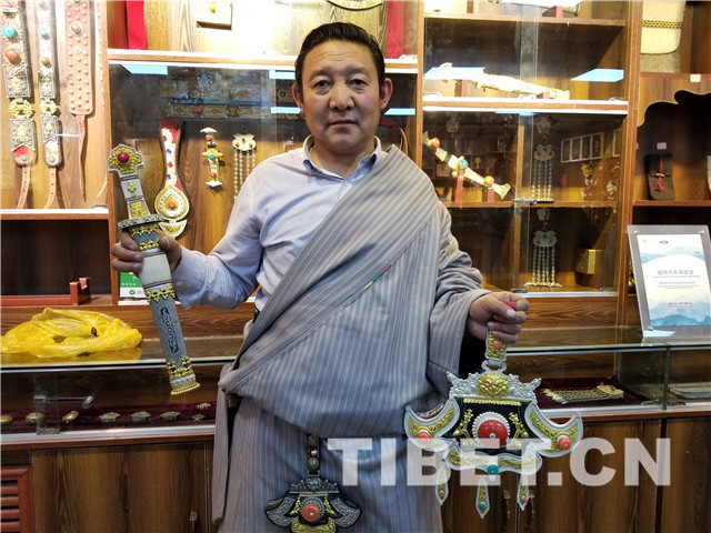 記者前年見過更求普措打制的“藏刀王”。藏刀王長約1.6米,刀鞘上鑲嵌有各種珍珠瑪瑙,造型美觀,讓人嘆為觀止。這次見他身著一身近似西藏管家的藏裝,那發型和淡淡胡子更讓感到一絲神秘。他話不多,但是展示的展品很多,最有名的還是傳承自家鄉稱多縣賽河鄉阿朵村的鐵器制品藏刀和火鐮。