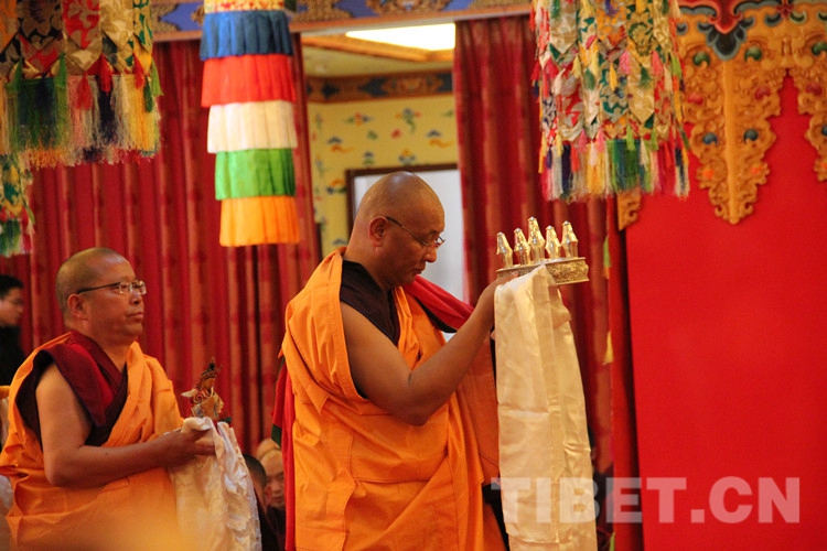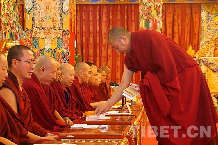 圖為土多申格副院長帶領經師代表和學員代表,虔誠地向十一世班禪敬獻曼扎、佛像、佛塔、佛經。攝影:孫健