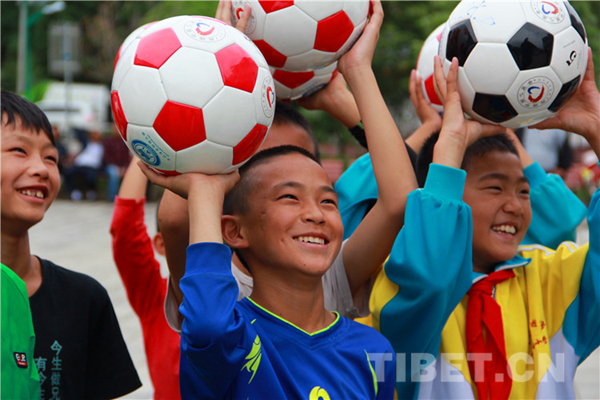 圖為香格里拉市金江鎮小學孩子拿到“愛心足球”