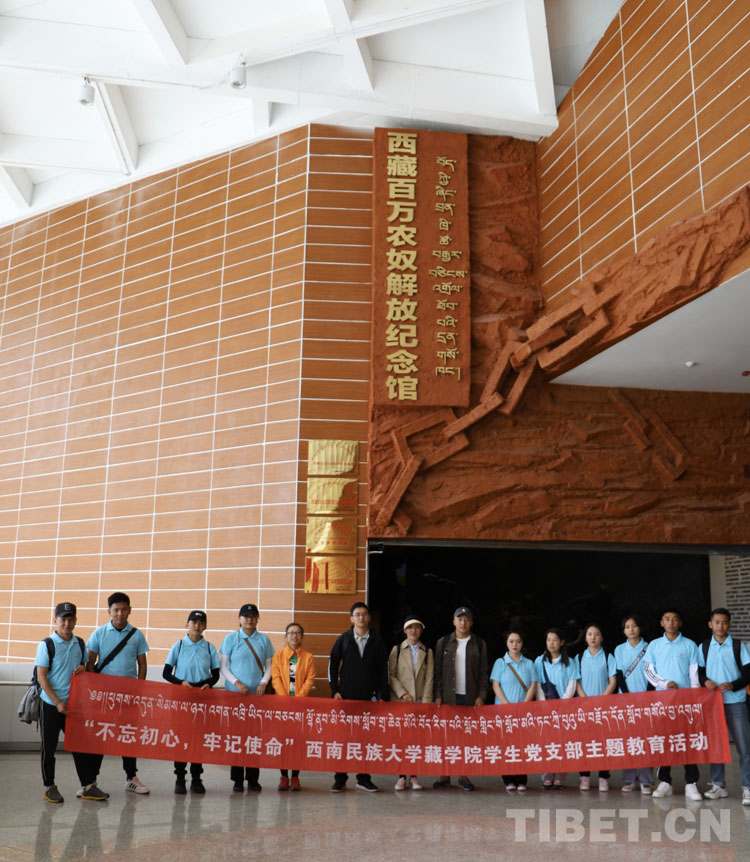 圖為暑期實踐團師生代表在西藏百萬農奴解放紀念館前