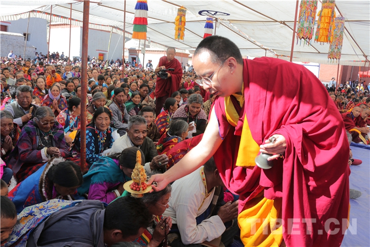 禮佛后,十一世班禪登上加查拉康正門前臨時寶座,接受托林寺僧人敬獻曼扎、切瑪等,隨后,在寺廟高僧引領下,為長壽灌頂貢品加持,帶領眾僧共同誦經,祈愿莊嚴國土、國泰民安、普渡眾生,為1000余名僧俗信教群眾進行長壽灌頂。