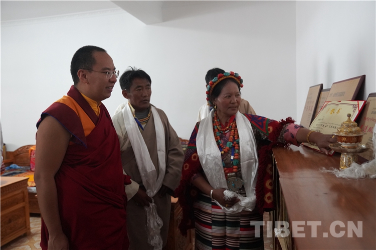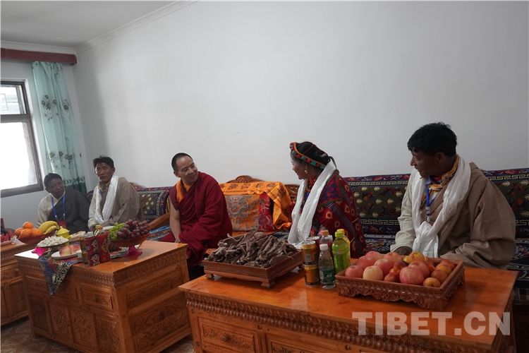 參觀朝拜活動結束后,十一世班禪還前往古格王朝遺址腳下的札布讓村走訪看望農戶金珠德吉并送去了慰問金。金珠德吉一家在家門口迎接十一世班禪并敬獻哈達,隨后迎請十一世班禪到客廳。十一世班禪與金珠德吉一家親切交談,詳細了解家庭生產生活情況。