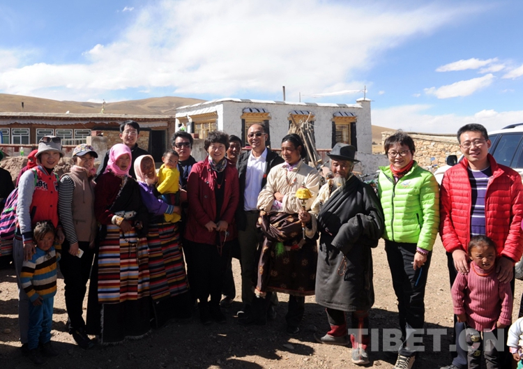 這是唐召明陪同中國評劇院藝術家和篩查先心病的北京安貞醫院小兒心臟病專家顧虹,來到藏北班戈縣青龍鄉采風、篩查先心病,并與牧民群眾合影留念。(唐召明提供,2015年10月8日攝)