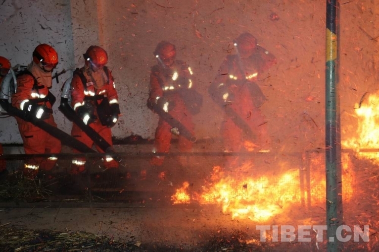 中國西藏網訊 12月17日晚,西藏自治區昌都市森林消防支隊左貢中隊展開了一場夜間實戰訓練,場面火熱。圖為實戰訓練中消防員們互相配合,撲打火線。