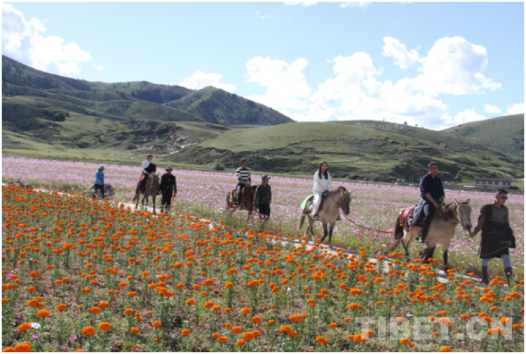 從理塘縣前往稻城亞丁機場方向60多公里,翻過一座小山坡,一片如夢似幻的花海景觀瞬間映入眼簾。曾經名不見經傳的小山村——濯桑鄉漢戈村已實現“沙化地”到“花海”的蛻變,成為新的網紅打卡點。在花團錦簇間拍照、在草原上騎馬,或者到旁邊康藏陽光種植基地采摘“極地果蔬”、購買農民合作社的原生態農副產品……游客可盡興體驗。