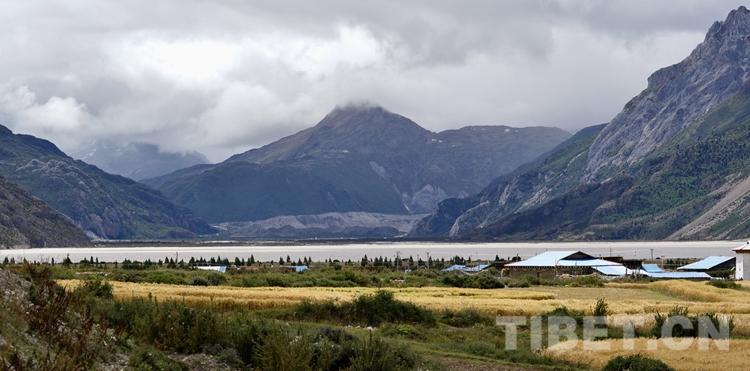 經318國道到然烏湖后,一條岔道出現在南邊,路牌上寫著“察隅”。然烏湖在我印象中是碧藍色的,這次卻因為連日降雨,眼前這個堰塞湖變成了水泥色。但是湖面開闊靜謐,湖邊的村子里一塊塊金黃色的青稞田,點綴著民房,也別有一番魅力。
