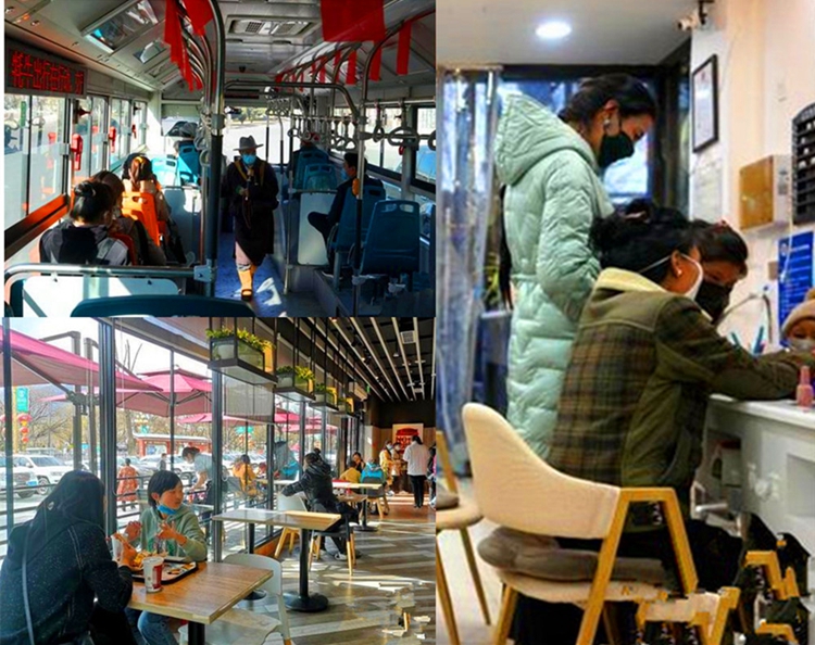 隨著西藏自治區連續50多天無新冠肺炎新增確診或疑似病例。近日,日喀則市發文明確,取消居家隔離、集中隔離,同時,各餐飲企業和個體餐飲門店恢復堂食,經濟社會逐步趨于正常。圖為市民生活如常,戴口罩坐公交、在餐飲店堂食、在美甲店美甲 圖片來源:中國新聞網