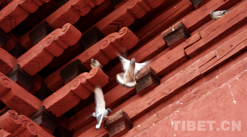 圖為生活在寺廟斗拱中的鴿子