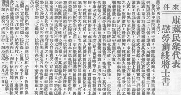 在內地期間,代表團發布了《西康民眾慰勞前線將士代表團敬告將士書》《西康民眾慰勞前線將士代表團回康宣告書》,宣傳抗日救亡,號召康藏廣大民眾積極投入抗日活動,以多種方式,為抗戰募捐。他們表示,“將西康民眾所捐之來貢獻中央,將來任務完畢回康,即將此次前方同矚實況,宣告西陲民眾,盡以地方人力物力,在政府指導之下,分期貢獻,而為諸位將士之后援,代表等并深以未及走遍各戰線為傷,就此謹祝我全體將士之健康,抗戰勝利萬歲!”