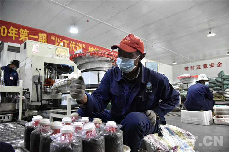 圖為日喀則市珠峰一見(jiàn)則喜生物科技示范園區(qū)裝袋車間里工人正在裝袋 攝影:王媛媛
