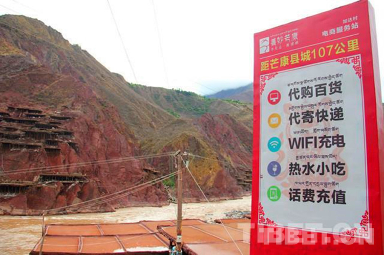 圖為千年古鹽田邊的芒康縣農(nóng)村電商服務(wù)站廣告牌。 攝影:李元梅