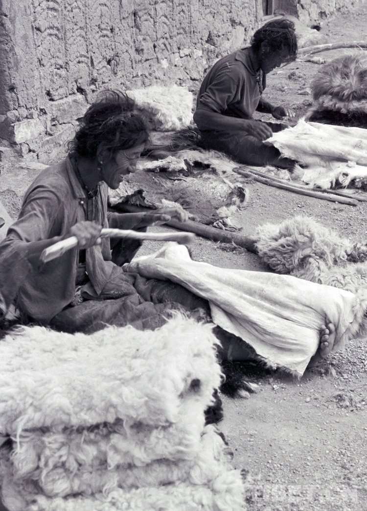 這是西藏南木林縣的藏族農民“候鳥”型打工族,在雙湖特別區(現改為雙湖縣)嘎措鄉為牧民人家揉皮子(唐召明2001年攝)