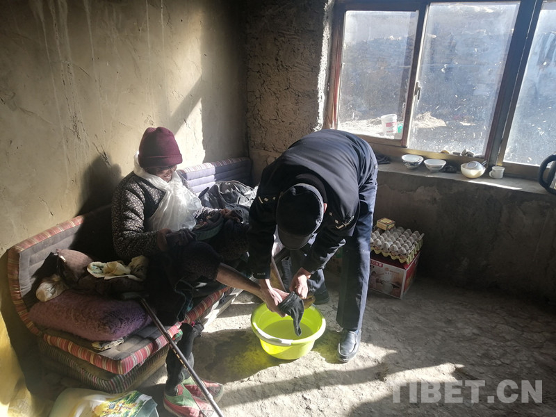 圖為達(dá)瓦次仁為熱薩鄉(xiāng)卡西村空巢老人洗腳