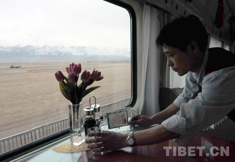 圖為全部為密封車窗,以防旅客投擲雜物。在通過藏北高原時,一位餐車人員正在整理餐桌(唐召明2014年攝)