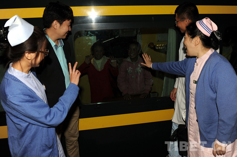 ——2012年9月28日,在北京接受免費救治的14名西藏先心病患兒術后與北京安貞醫院和北京兒童醫院醫護人員告別,乘火車返回西藏。