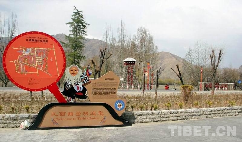 圖為扎西曲登社區引以為豪的“藏戲第一村”標志 攝影:劉莉