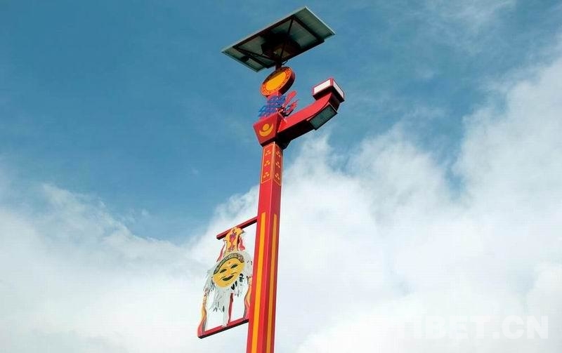 圖為扎西曲登社區中的路燈也裝扮上了特色濃郁的扎西雪巴藏戲黃面具 攝影:劉莉