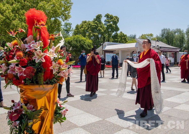 10日上午,班禪專程來到位于上海市青浦區練塘鎮的陳云紀念館,認真聽取了陳云同志有關事跡,并向陳云銅像敬獻哈達,追思陳云同志愛國憂民、為共產主義事業鞠躬盡瘁的偉大一生……