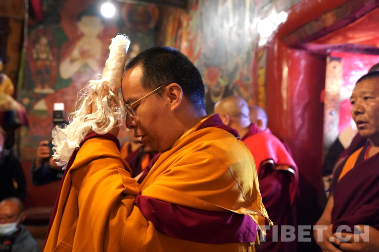當(dāng)日下午,班禪登上拉讓日光殿寶座,接受扎什倫布寺管委會(huì)僧人成員、高僧的朝拜,為他們摸頂賜福,并帶領(lǐng)高僧集體誦經(jīng)祈禱。