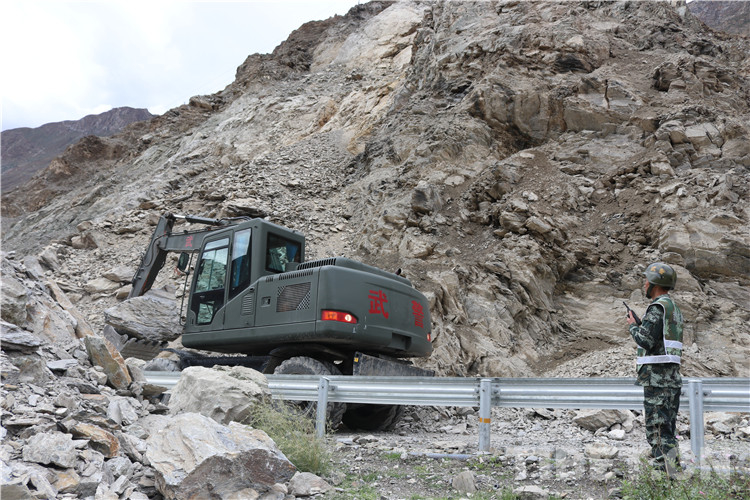 抵達現場后,武警官兵及時對災害路段實施交通管制,并把滯留車輛疏導至安全區域,隨即對泥石流堆積物和塌方體進行清理。因災害點處于峽谷地帶,地勢十分險要,作業面狹窄,且降雨及落石持續不斷,為確保搶通工作高效安全,指揮員科學指揮,安全員高度警惕,操作手快速搶通,各要素密切配合,給道路搶通工作爭取了寶貴時間。