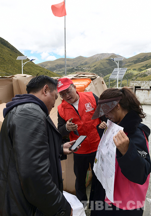 這是北京建藏援藏工作者協(xié)會志愿服務組人員張建(中)在西藏那曲市索縣西昌鄉(xiāng)指導牧民群眾用手機掃碼進行高原撿拾車的視頻學習(唐召明2021年9月14日攝)