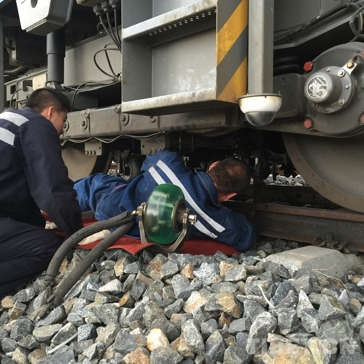 即將達到加查站時,探傷員余賢明發現探傷車左側第2個探輪有破損現象,需要更換探輪,大家立刻按照分工各就各位。隊長聯系集團公司調度、加查站安排探傷車停靠車站,設置好防護后,李生紅和余賢明立即鉆到車下拆卸破損探輪,崔成剛和李慧臣則準備好新的探輪。四個人分工協作,在夜幕降臨之前將新的探輪安裝了上去。