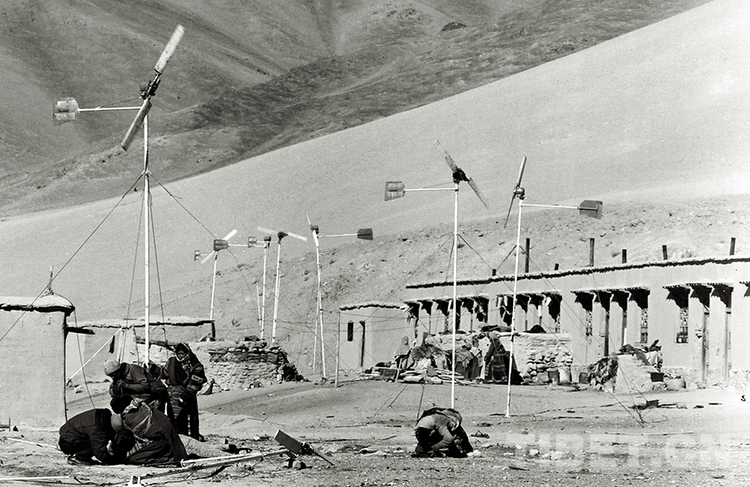 這是那曲地區(現那曲市)風能實驗站的技術工人在幫助嘎措鄉一村村民維修保養風力發電機(唐召明1988年攝)