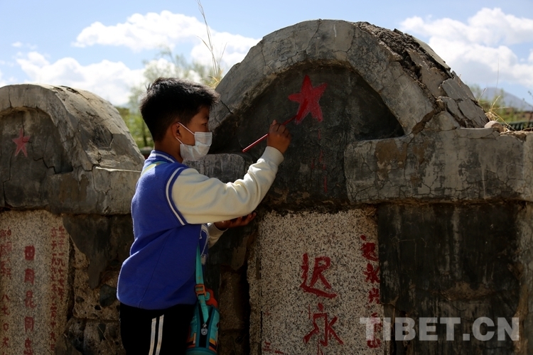 圖為榮灝達瓦為革命烈士墓碑上的紅星增添顏色 攝影:王佳豪