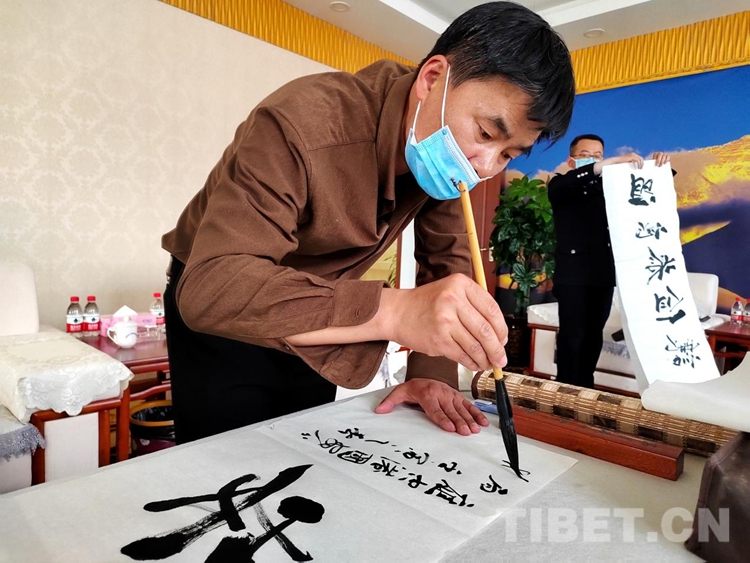 活動邀請的西藏自治區文聯3名書法家在現場潑墨揮毫。在場民警們紛紛在佳作前駐足欣賞,細細品味,感受到了筆墨之美,并與書法家們面對面交流,虛心求教。此外,西藏自治區文聯贈送四幅書法作品以示祝賀。