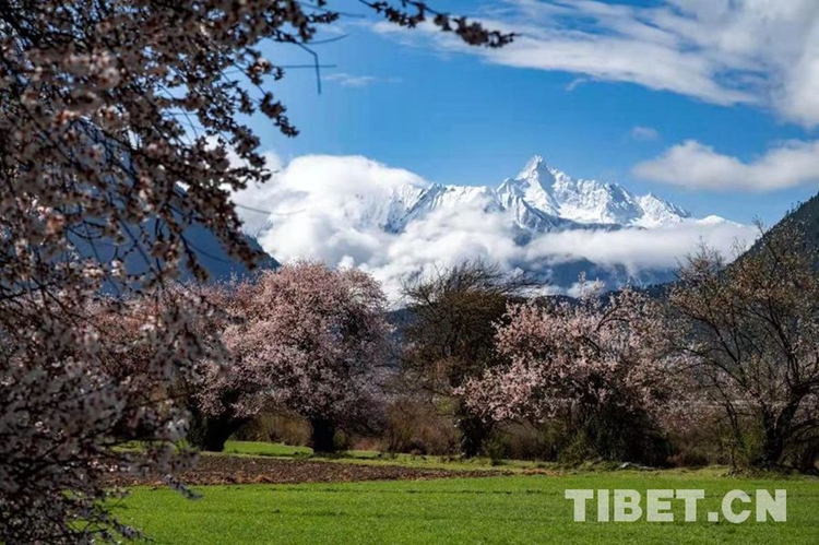 圖為雅魯藏布大峽谷景區雪山和桃花映襯