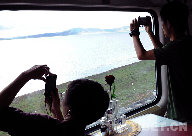 這是京藏列車在通過錯那湖時,旅客們紛紛用手機拍攝美景(唐召明2012年8月12日攝)