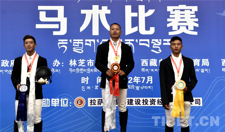 圖為7月17日競技馬術項目場地障礙個人賽頒獎現場(中間為冠軍選手日喀則市代表團巴迪,左邊為亞軍選手山南市代表團選手諾桑,右邊為季軍選手林芝市代表團單增洛追) 攝影:德吉卓嘎